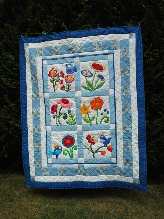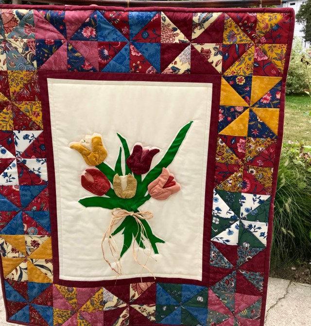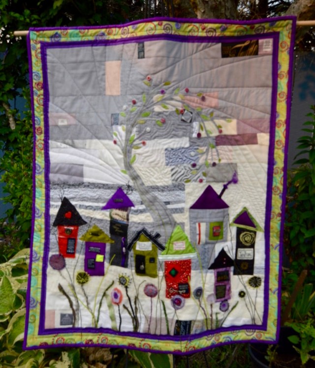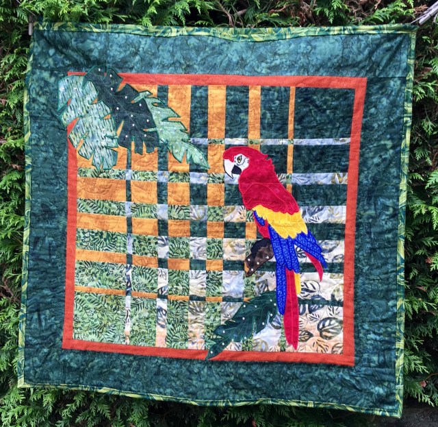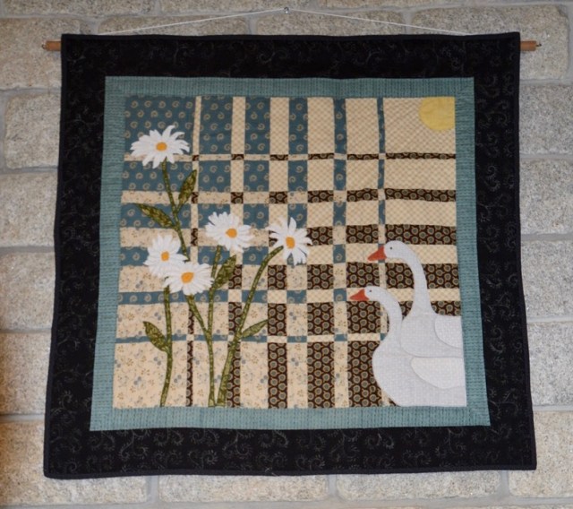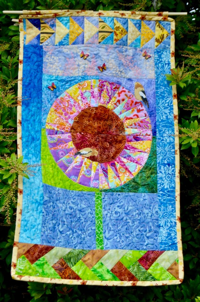 A sunflower growing in the front yard hosting a yellow finch inspired this wall hanging by Marjorie H