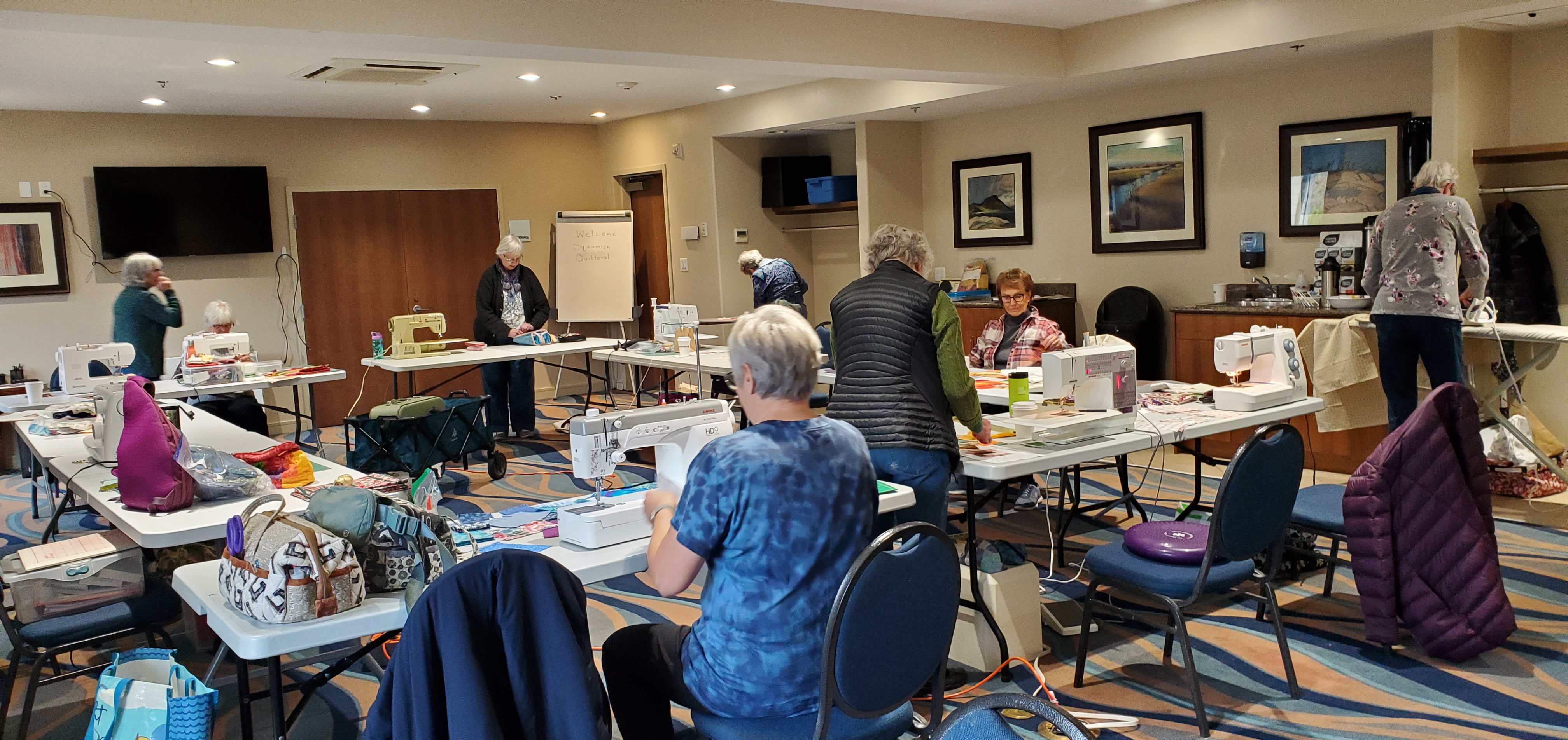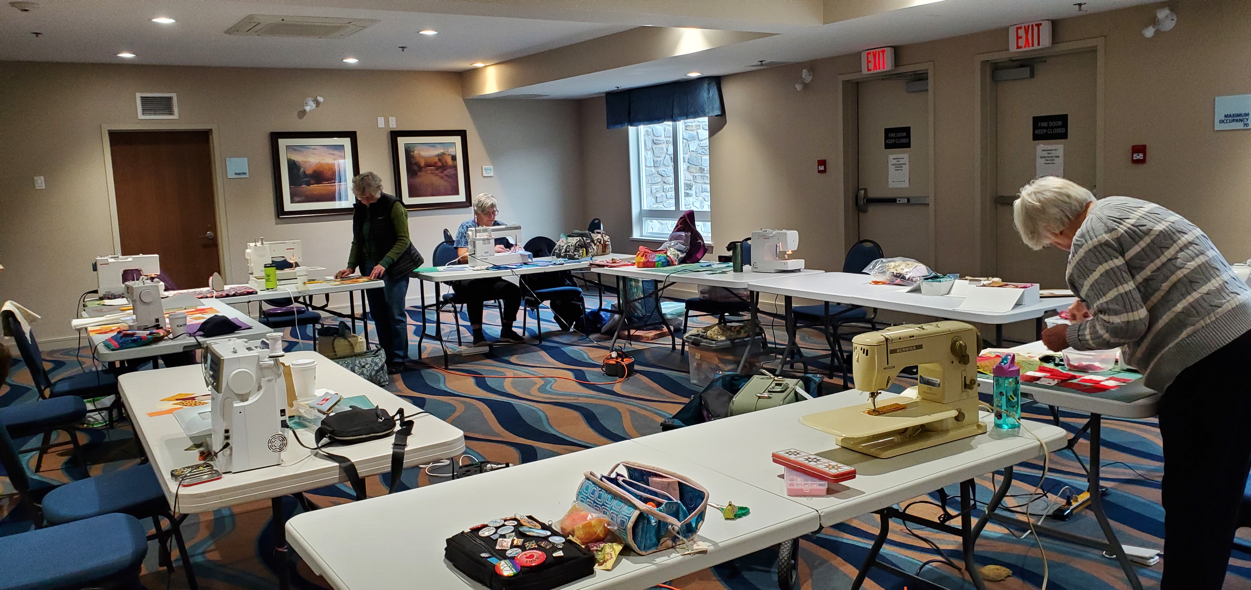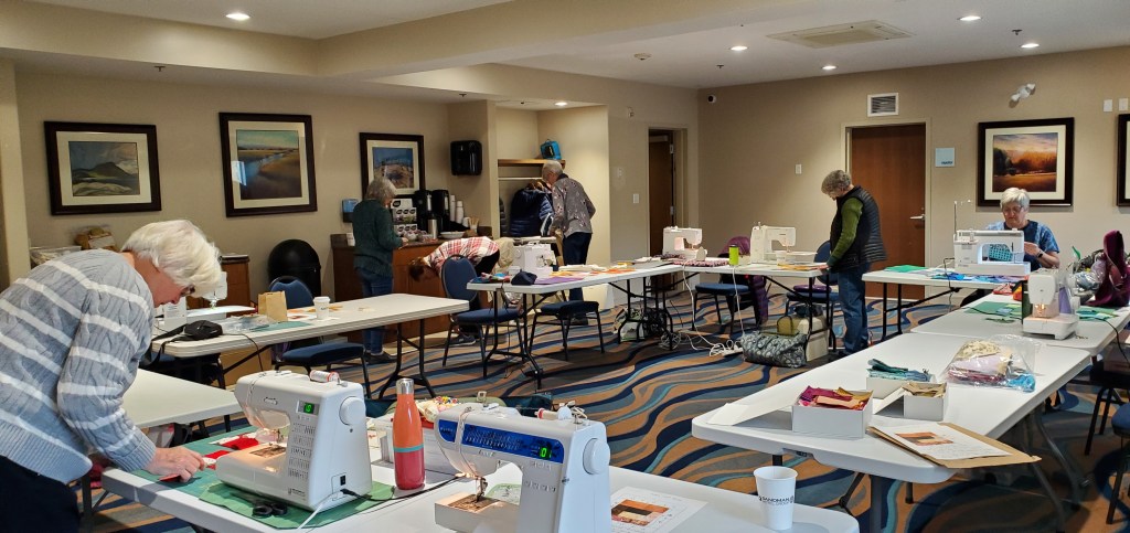 To my mind, one of the most important elements of belonging to our guild is the ability to support our community through our community quilts projects. We are blessed to have many angels in our guild who prepare kits, maintain the guild storage locker, sew quilts for donation and generally keep us contributing to support those in need of a nice warm hug. The role of Community Quilt volunteer has been ably managed by many people over the years and I would like to thank them all for their support and service. This year’s volunteers are Diane Kresak, Karan Riches and Susan Ritchie. At the November sew day we all came together to make blocks for some new community quilts – it was a lovely day and here are some photos to remind us of the joy of working together for a common purpose.